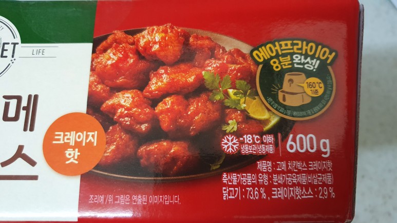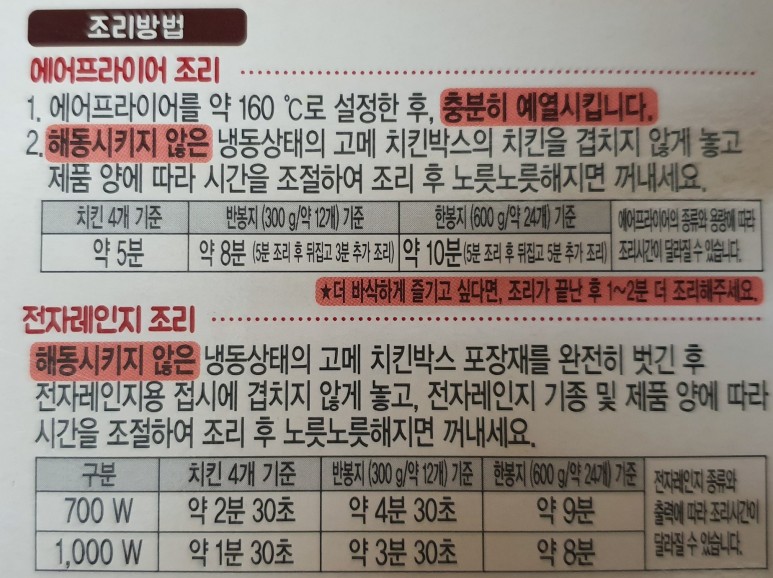 조리 방법이다. 로스트 치킨과 마찬가지로 에어프라이어 단독 조리, 전자레인지 조리, 에어프라이어 + 전자레인지 혼합 조리법이 적혀있다. 이 제품같은 경우는 에어프라이어에 들어가지 않을 일도 없고, 이미 한 번 튀겨진 제품이기 때문에 더더욱 전자레인지에 넣으면 안 될 것 같다.