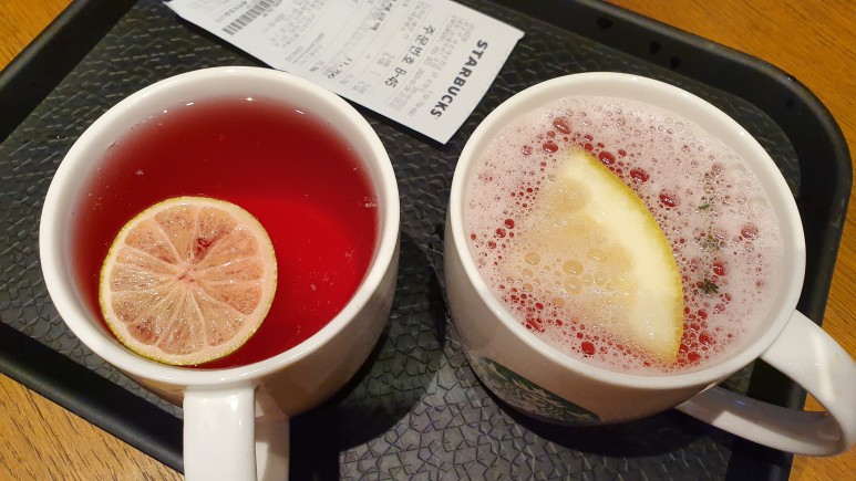 주문을 마쳤다. 여자친구는 라임 패션 티, 나는 BTS 블루밍 퍼플 뱅쇼를 주문했다.