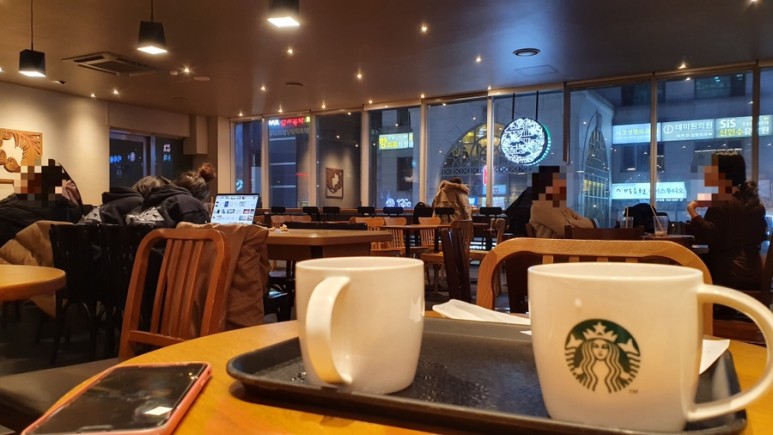 둘다 톨 사이즈인데 머그컵이 큼직해서인지 배가 부를 것 같다는 걱정이 들기 시작했다. 오기 전에 밥을 정말 푸짐하게 먹긴 했으니 말이다.