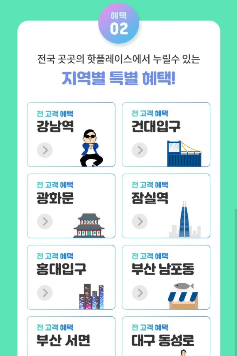 이게 뭐지? 궁금해서 T멤버십 어플에 들어가봤다. 5G의 범용적인 혜택은 줄어들었지만 지역별 특별 혜택이 이곳저곳에 있는 모양이었다. 아쉽게도 서울에 많이 집중되긴 했지만, 이런 소소한 혜택들을 기대하지 않고 있다가 만나게 될 때면 반갑고 또 SKT를 사용하길 잘했다는 생각이 들곤 한다.