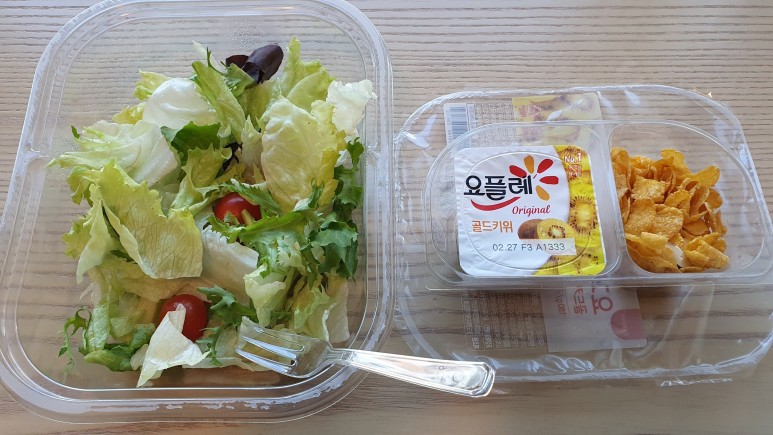 구성은 굉장히 담백하다. 샐러드가 들어있고 시리얼 후레이크와 요플레 골드키위다.