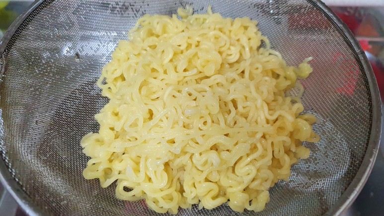 잘 끓인 면을 채에 넣고 냉수로 마사지해주자. 면발이 아주 탱글탱글해진다.