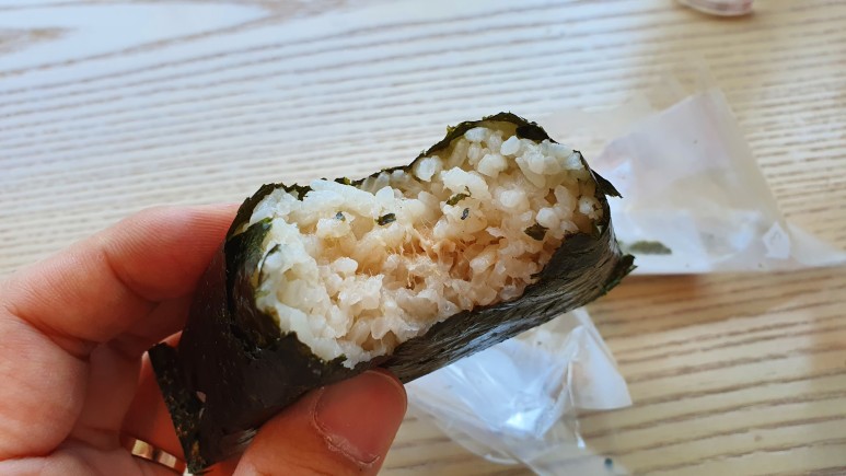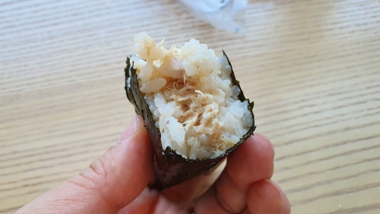 먼저 참치마요 삼각김밥을 위에서 한 입 베어물었다.