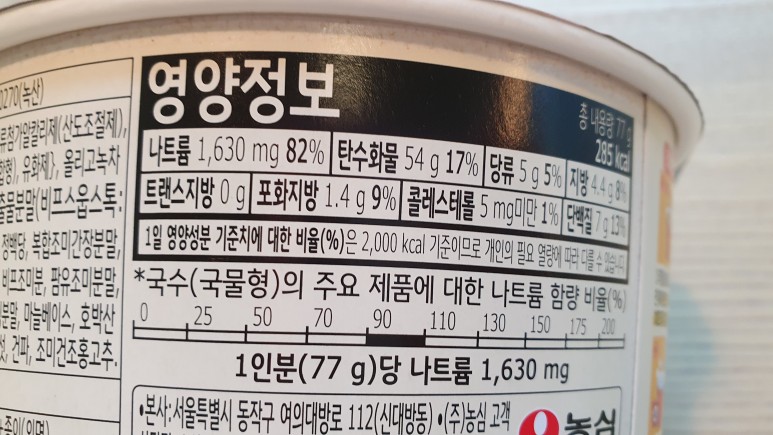 나트륨 양이 상당하지만 나는 대체로 국물을 다 마시지 않고 거의 대부분 남기는 편이다. 그것만 안 해도 나트륨 섭취량을 많이 줄일 수 있다고 한다. 밥이라도 말아먹는 날에는... 나트륨과 탄수화물의 대축제다.