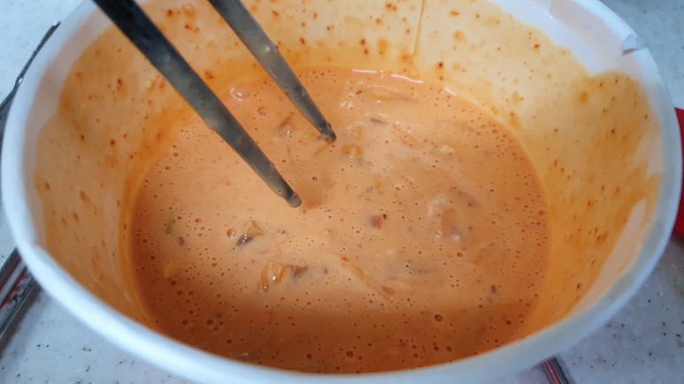 제품은 이렇게 생겼다. 김치소스와 부침가루인데, 김치소스에는 결코 적지 않은 양의 김치가 들어있었다.