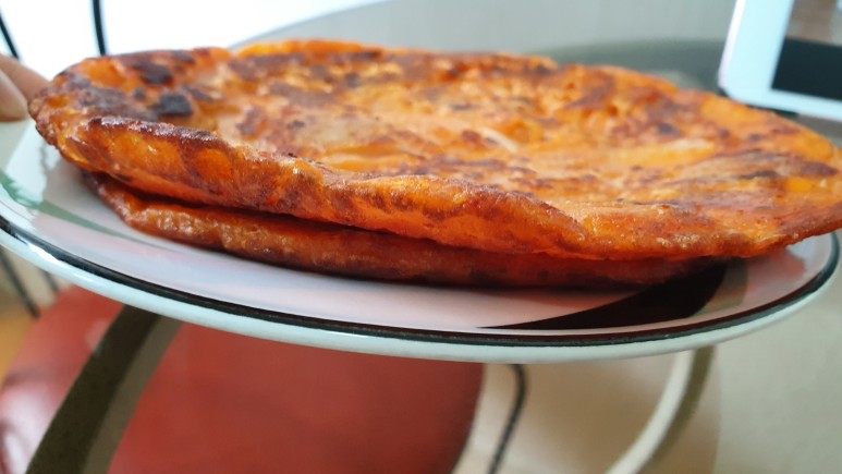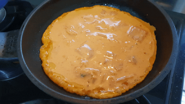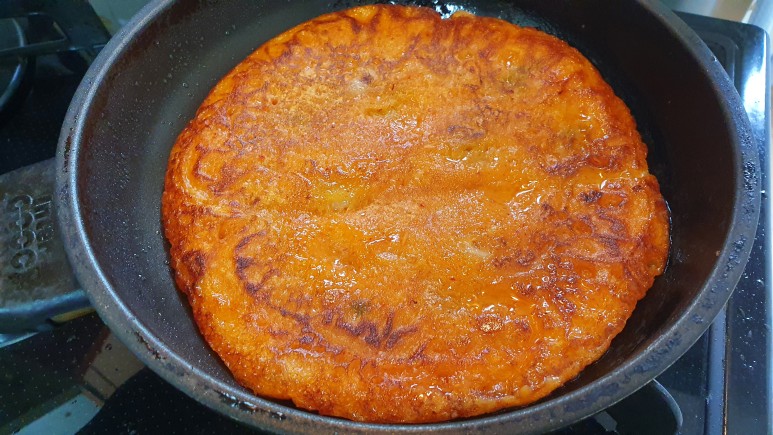 그럼 신나게 부쳐보자! 작은 팬으로 만들어봤는데 넉넉한 두 판이 만들어지는 양이었다.