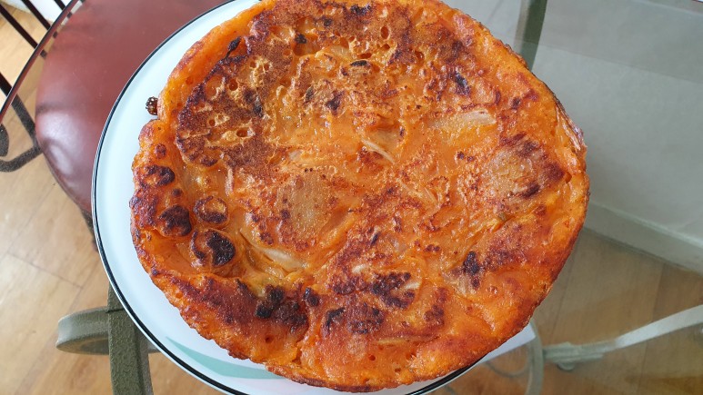 처음에 소심하게 부쳤는데 두 번째는 좀 더 큰 김치전이 만들어졌다. 위에 얹어보니 차이가 좀 보인다.