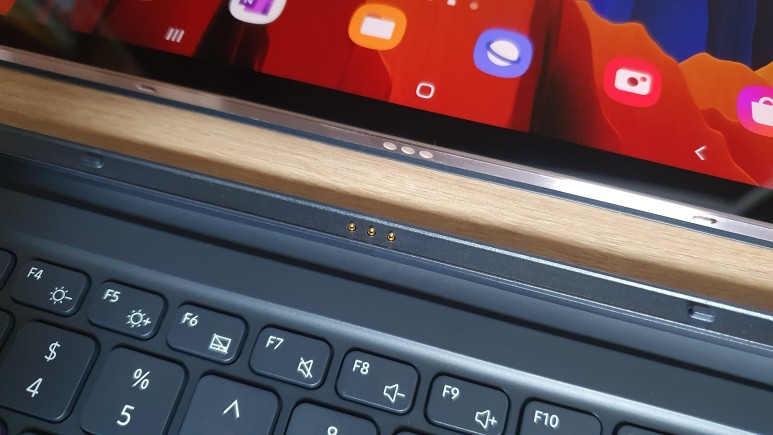 북커버 키보드는 중앙의 포고핀 단자를 연결해서 키보드에 전류를 보낸다. 키보드 자체에는 배터리도 뭣도 없고, 순수하게 갤럭시 탭S7 플러스의 배터리를 이용하는 것이다.