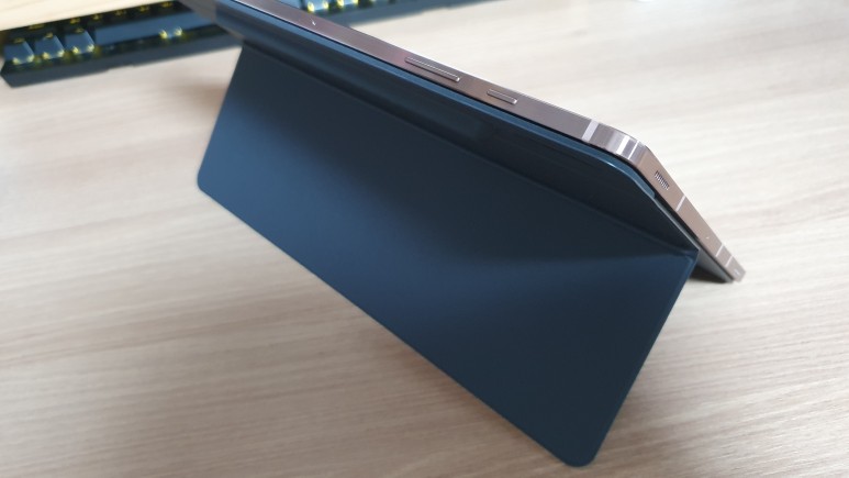 어쨌든 간편하게 열어서 수납하거나 꺼낼 수 있어서 만족스럽다. 눕혀서 사용할 때는 왠지 은근하게 받침이 있는 것 같아서 또 다른 묘한 안정감을 준다. 카툭튀로 덜컥거리는 것과는 약간 다르다. 물론 우측에는 공간이 남아있기 때문에 어느 각도에 S펜을 사용하느냐에 따라 덜컥거리게 되는 부분은 다소 아쉬운 점이다. 우측에도 볼록한 공간을 마련해두었다면 펜 사용 시 케이스가 흔들리는 것을 방지할 수 있지 않았을까?