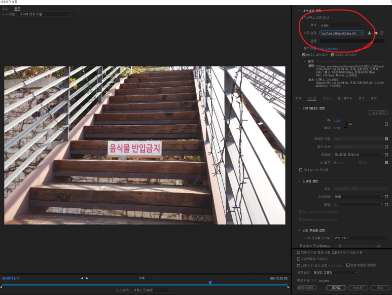 영상편집 프로그램은 어도비 프리미어이고, 내보내기 설정은 H.264에 프리셋은 유튜브 4K 설정을 그대로 사용했다.