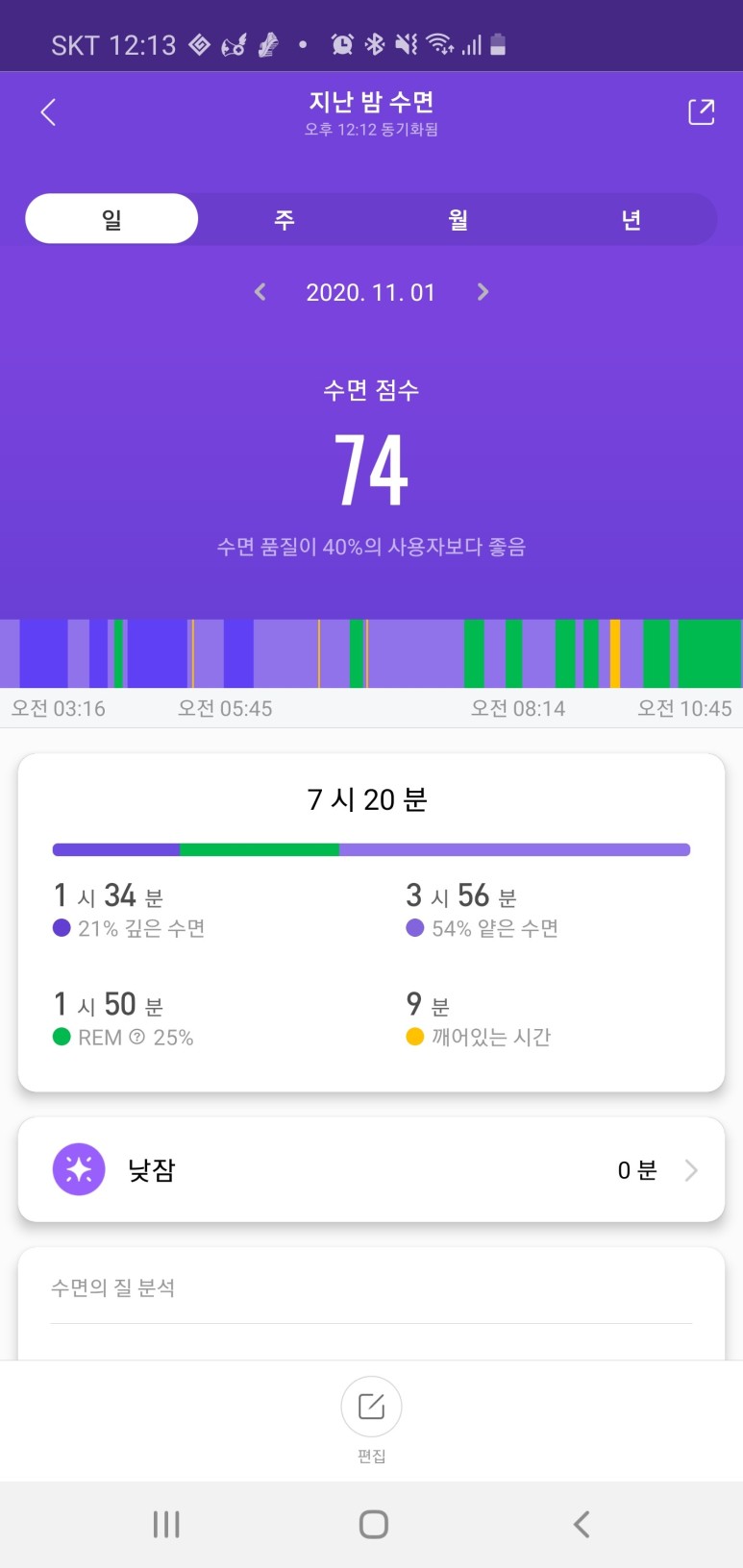 갤럭시핏2의 수면은 세세하게 어떤 시간에 무엇을 했는지를 뜯어보기가 어렵다. 그래프를 보고 어림잡아볼 수는 있지만 그것뿐이다.