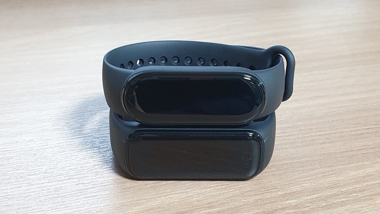 본체가 각진 것이 갤럭시핏2(아래), 타원형을 띤 것이 미밴드5(위)다.