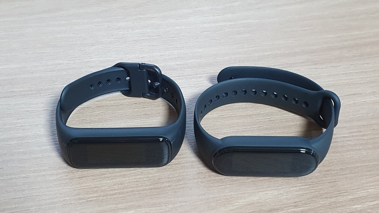 스트랩은 좀 더 반달처럼 생긴 것이 갤럭시핏2(좌), 둥글게 생긴 것이 미밴드5(우)다.