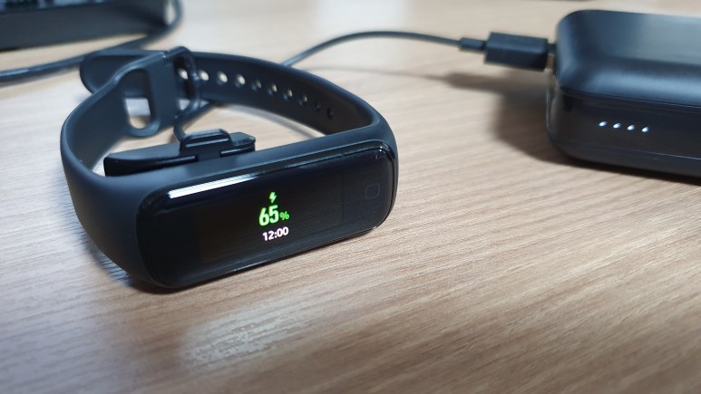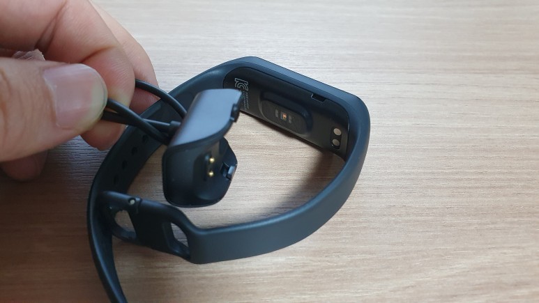 포고핀 충전 방식인데, 미밴드5는 자석으로 착 붙여서 간단하게 충전이 가능한데 비해 갤럭시핏2는 끼워야한다. 번거롭진 않지만 더 편한 걸 한 번 접한 탓인지 아쉬움이 느껴질 수밖에 없다.