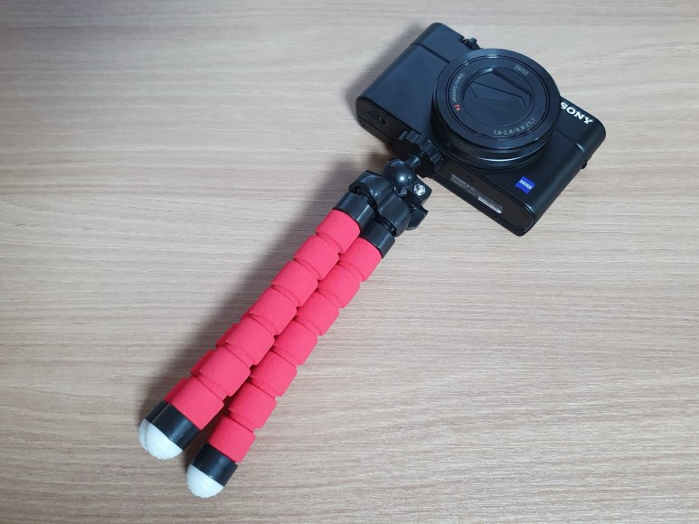 마지막으로 삼각거치대의 성능을 알아보자. 컴팩트카메라도 버틸 수 있다는 것을 보고 집에 있는 (아직 리뷰하지 않은) 소니의 RX100 M3 하이엔드 카메라를 거치해보았다. 아주 잘 버틴다. 다만 너무 앞으로 각도를 숙이면 무게가 다소 있는 제품이다보니 금방 앞으로 쏠린다. 중심을 잘 잡아가며 촬영하는 것이 좋을 것 같다.