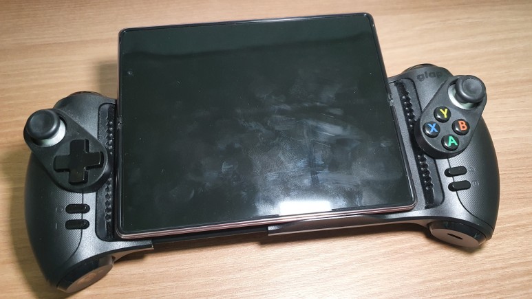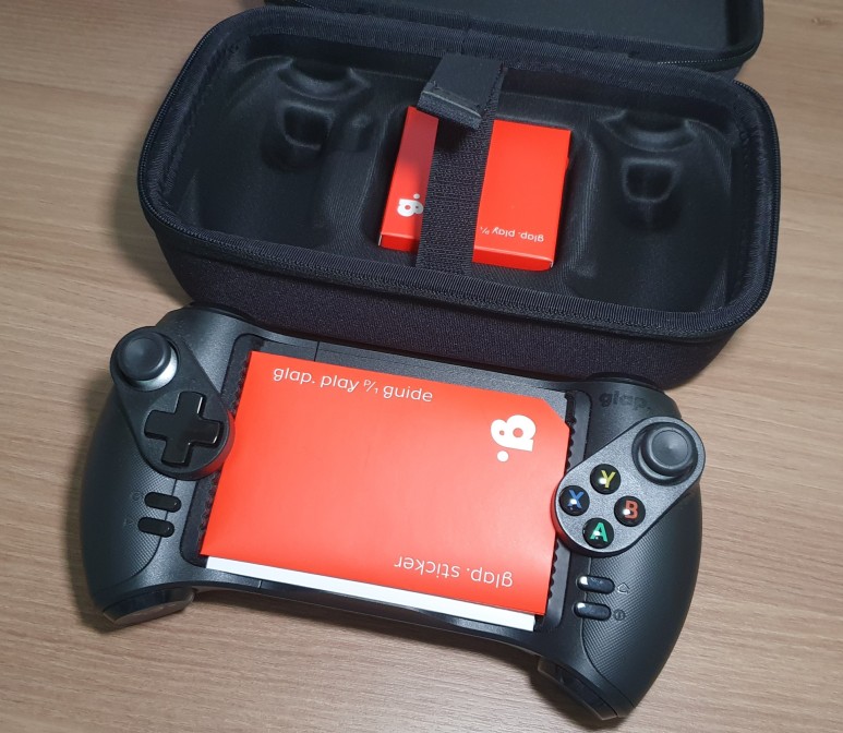 글랩 게임패드는 굉장히 넓게 펼쳐진다. 세로길이가 162.3mm에 달하는 노트10+에도 장착이 되는데, 최대 190.5mm까지 장착할 수 있다고 한다. 두께는 10.1mm까지 지원하기 때문에 두꺼운 케이스를 끼운 상태에서는 게임패드에 장착할 수가 없다. 되도록 케이스 없는 상태에서의 장착을 권장하고 있다.