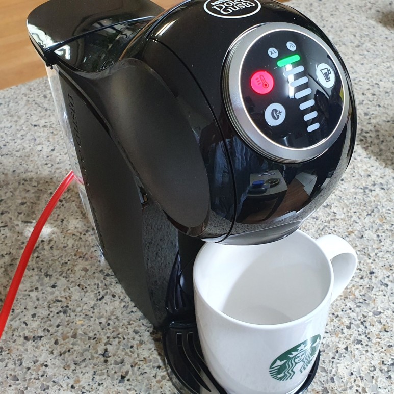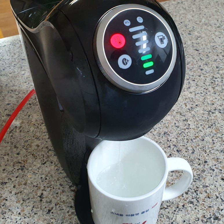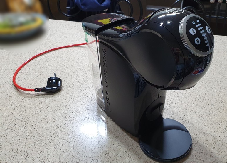 돌체구스토 지니오 S 플러스는 유광 재질을 보이고 있습니다. 전원 케이블은 붉은 색인 것이 특징인데요. 이 선이 꽤 짧기 때문에 콘센트와 먼 곳에는 두기 힘들다는 단점이 존재합니다. 만약 불가피하다면 콘센트 연장선을 별도로 구비해서 연결해주는 방법을 선택할 수밖에 없겠네요.