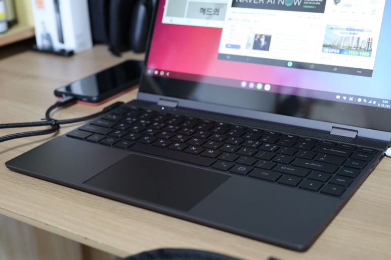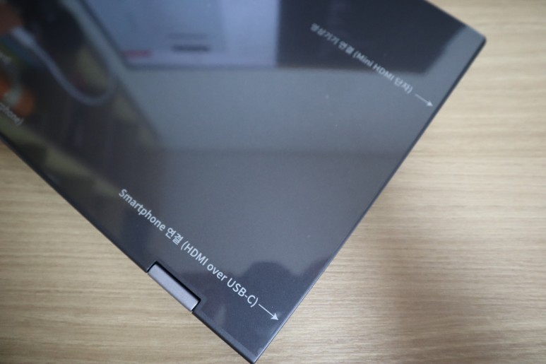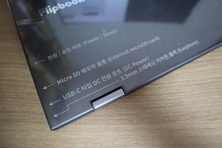 전원/슬립 버튼, 마이크로 SD 메모리 슬롯, C타입 전원단자, 이어폰 출력 단자, HDMI 입력 단자, 스마트폰 연결용 C타입 단자가 있는데요. 단자가 다소 부족하다는 이야기도 있지만 애초에 플립북은 노트북이 아니기 때문에 추가로 USB를 연결할 일이 많을 것 같아보이진 않습니다.