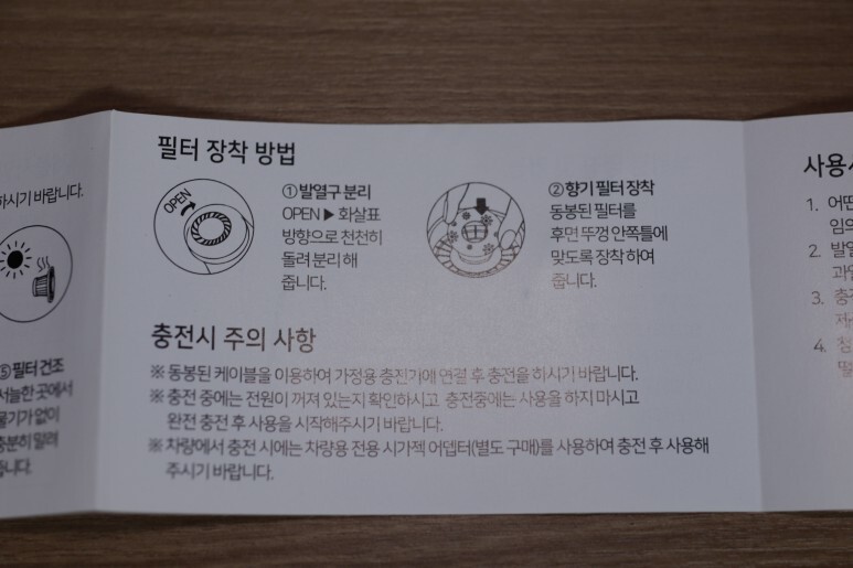 설명서도 들어있는데 세척 방법과 필터 장착 방법은 정말 간단하게 적혀있습니다. 필터를 장착하는 방법만 확인하면 될 것 같고, 세척은 우리가 흔히 공기청정기의 필터를 세척하고 말리듯이 똑같이 하면 되는 모양입니다.