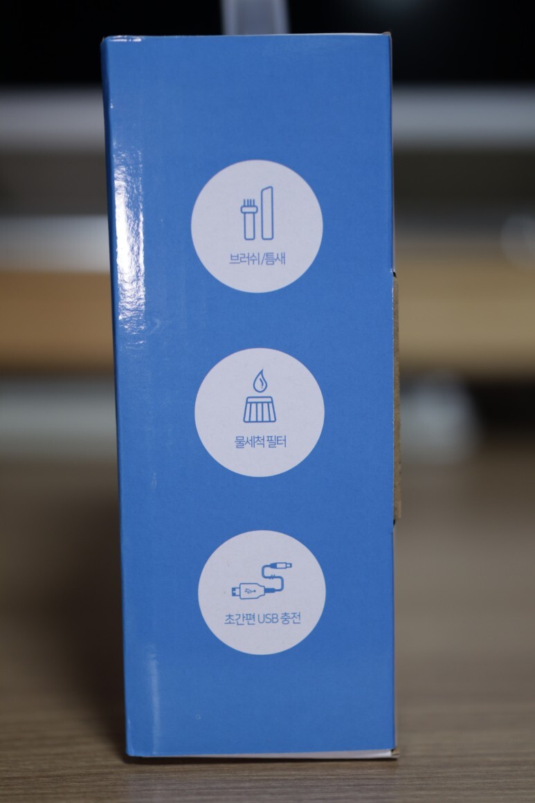 구성품은 본체, 브러시와 틈새용 노즐, USB 전원 케이블과 항균필터가 들어있습니다.