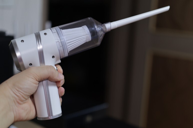 이 제품이 신기한 이유는 두 가지가 있는데요. 하나는 다른 차량용 청소기와는 다르게 전동 드릴 같은 건타입의 모양을 가지고 있다는 점입니다. 그리고 두 번째로는 후면에 향기 필터를 부착할 수 있다는 점입니다.