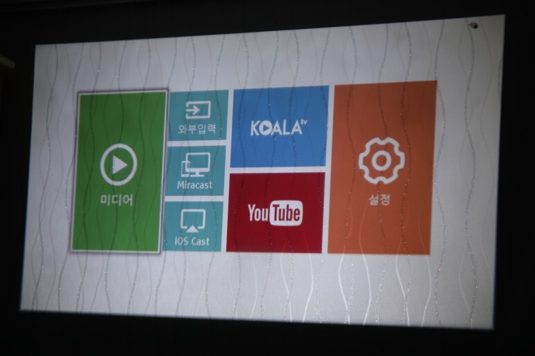 전원을 켜면 미디어, 외부입력, 미라캐스트 iOS 캐스트, 유튜브, 설정 등의 메뉴가 등장합니다.