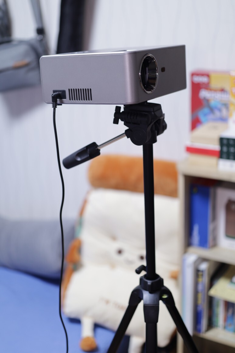아무래도 연결부가 앞쪽에 위치하다보니 빔프로젝터가 뒤로 무게중심이 쏠릴 수밖에 없었는데요. 만약 약한 삼각대를 사용한다면 무겁고 튼튼한 삼각대를 사용하는 것을 추천드립니다. 왜냐하면 무게중심으로 인해 뒤로 넘어갈 수도 있겠구나 하는 생각이 들었거든요.