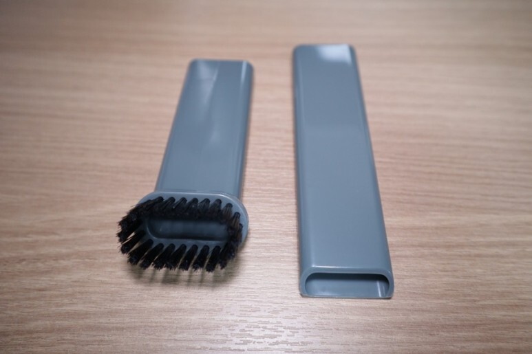 하지만 이 두 가지 타입의 노즐을 장착하면 좀 더 좁은 틈새까지 청소할 수 있게 되죠. 브러시 타입으로는 틈을 가볍게 솔질하며 긁어내고 그 때 튀어나온 먼지들을 흡입하는 용도로 사용될 수 있습니다. 좀 오래 쌓인 먼지라거나 키보드 틈새와 같이 일반 노즐로는 청소하기 어려운 곳들을 시원하게 긁어주는 용도입니다.