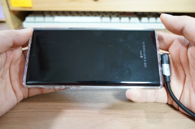 충전중인 스마트폰을 양손에 올려 파지했을 때 이렇게 안정적으로 올려놓을 수 있는 것이죠.