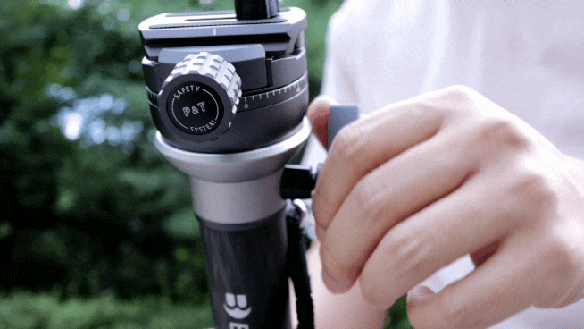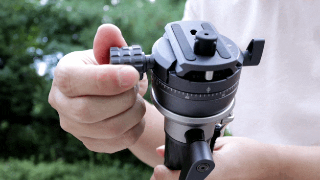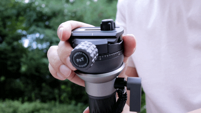 이건 퀵 릴리스 노브 반대편에 위치한 작은 레버를 돌리면 풀 수 있는데요. 이것 역시 각도 제어와 마찬가지로 정말 무겁고 스무스하게 작동합니다. 이 팬 회전은 영상을 좌우로 돌려가며 흔들림 없는 촬영을 하기 위해 꼭 필요한 기능입니다. 모노포드를 바닥에 지지해 고정한 상태에서 상하좌우 팬을 모두 풀어놓고 영상을 촬영한다면, 수평을 유지하면서 유연하게 높낮이에 제한받지 않는 촬영을 할 수 있을 것입니다.