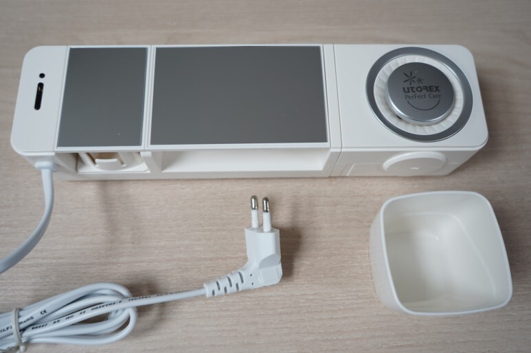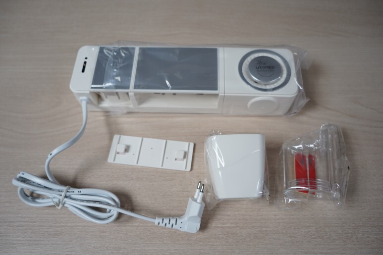 기본 구성품입니다. 유토렉스 UTC-57MW 가정용 칫솔살균기 화이트 본체와 함께 벽면에 부착하는 걸이, 양치컵과 함께 치약 거치대가 들어있었습니다.