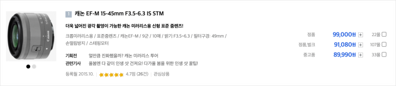 캐논 렌즈의 경우 22mm(환산화각 35mm) 렌즈 기준으로 20만원대 가격을 형성하는데요.