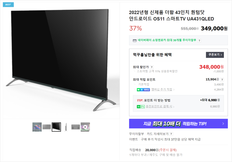 제품명은 2022년형 신제품 더함 43인치 퀀텀닷 안드로이드 OS11 스마트TV UA431QLED입니다.