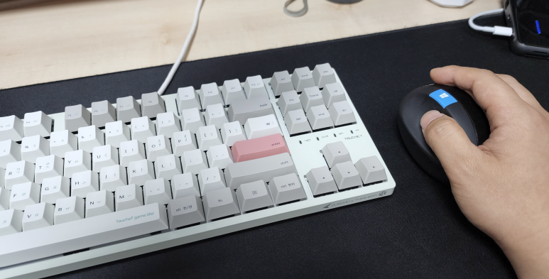 키보드를 중앙에 둘 경우 마우스를 잡은 오른손이 좀 더 벌어져 피로도가 쌓이는 느낌이 강했습니다.