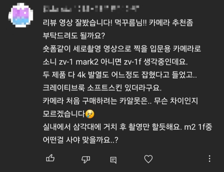 숏폼 촬영을 위해 ZV-1 M2, ZV-1F 중 하나를 선택해서 추천해달라는 내용입니다.