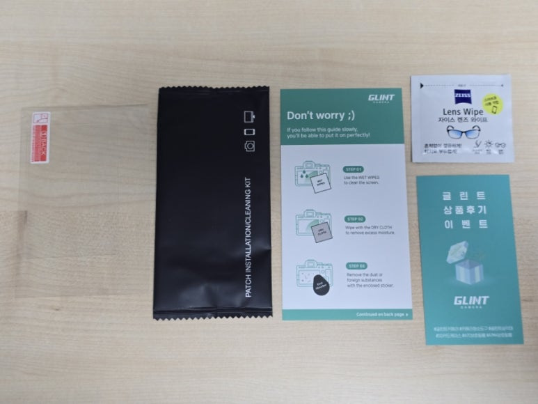 액정보호필름에 언박싱이랄게 있겠냐마는 그래도 구성품 간단하게 펼쳐놓도록 하겠습니다. 강화유리필름과 먼지제거제, 융, 그리고 자이스 렌즈 와이프가 있습니다. 이 중에서 가장 눈이 가는 건 역시 자이스 렌즈 와이프네요. 카메라 유저들의 마음을 잘 아는 회사인 것 같습니다.