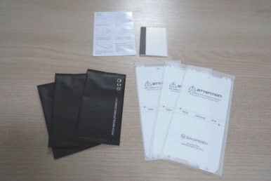 스폰지 소재로 된 완충제 안에 3개의 액정보호필름과 3개의 부착용 보조도구들이 들어있습니다.