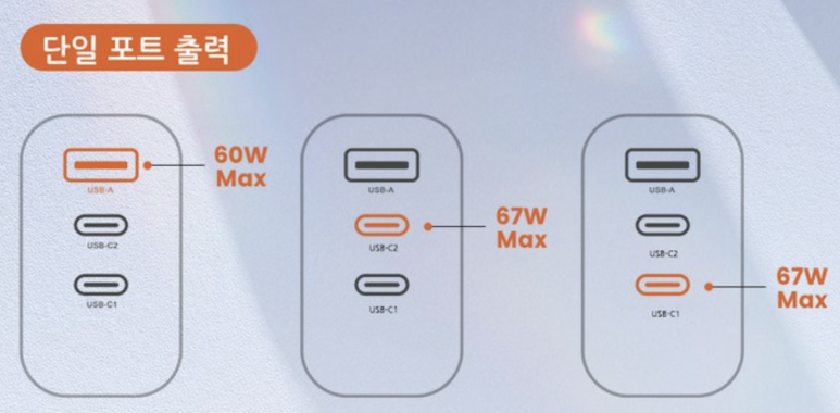 어떤 포트를 사용해도 67W로 충전이 된다는 게 가장 인상적이고요.
