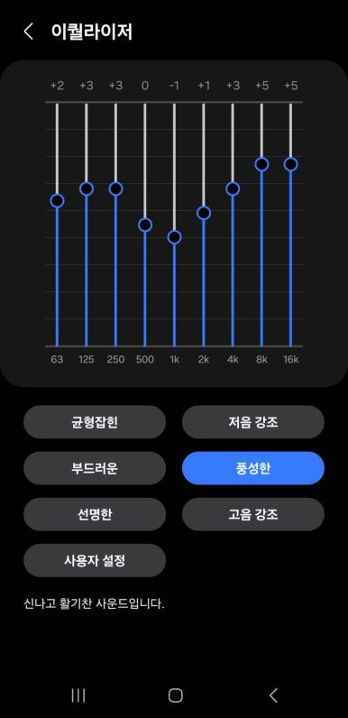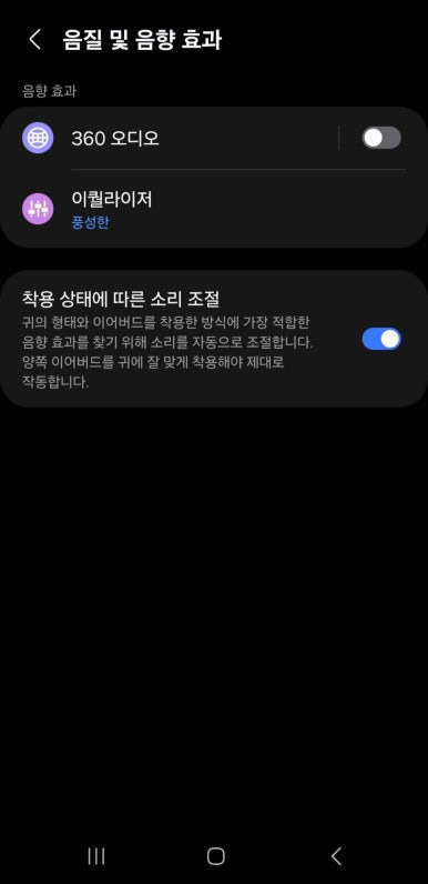 음향을 좀 더 향상시키기 위해서는 'Wearable' 앱의 '음질 및 음향 효과'에 들어가셔서 이퀄라이저를 풍성한으로 세팅해주시면 됩니다.