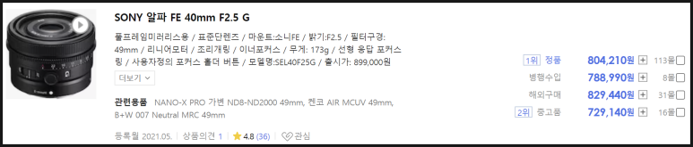 소니 40g 단렌즈의 모델명은 sel40f25g입니다.