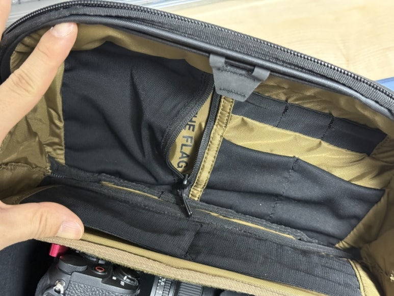 여기에 렌즈 필터를 넣을 수 있는 포켓이라거나 배터리 수납 공간이 있긴 한데 좁습니다. 앞서 얘기한대로 지갑이나 스마트폰을 넣는 순간 이제 아무것도 넣을 수 없게 되니까요.