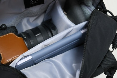 내가 별도로 사용중이던 노매틱 슬링백에서 가장 아쉬웠던 대목이 바로 태블릿PC 수납공간의 부재인데, 이 츄루루 루모 숄더백에는 수납공간이 있다. 최대 11인치까지 수납이 가능한데, 나는 여기에 8인치의 아이패드 미니 7세대(A17 Pro) 모델을 넣고 다닌다. 태블릿PC를 넣는 공간이 중요한 이유는, 여행지에서도 바로바로 카메라와 연동해서 결과물을 확인하고 보정할 수 있기 때문이다.