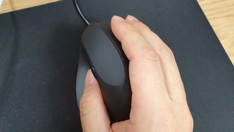 파지하면 대략 이런 느낌이 된다. 기존 마우스가 마우스 위에 얹는 방식이라면 이건 살포시 쥘 수 있도록 해놨다. 쥘 수 있어야 좌우로 활발하게 움직일 수 있기 때문이겠지.