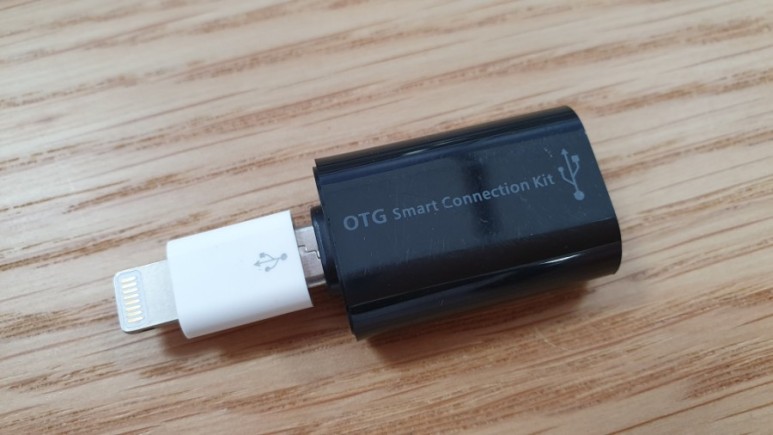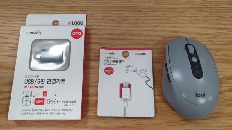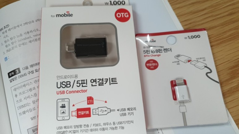 그래서 USB-5핀, 5핀-8핀(라이트닝) 젠더를 하나씩 가져왔다.