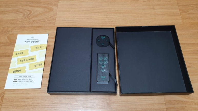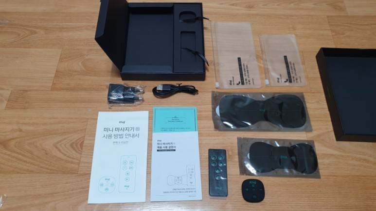 위쪽에 작은 녀석은 마사지기 본체이고, 아래 길다란 건 리모컨이다. 등에 붙인 경우 제대로 조작할 수 없기 때문에 리모컨을 통해 컨트롤을 할 수 있을 것이다. (아니 근데 애초에 그 정도로 조작이 안 될 곳이면 혼자 붙일 수 없는 거 아닌가?)