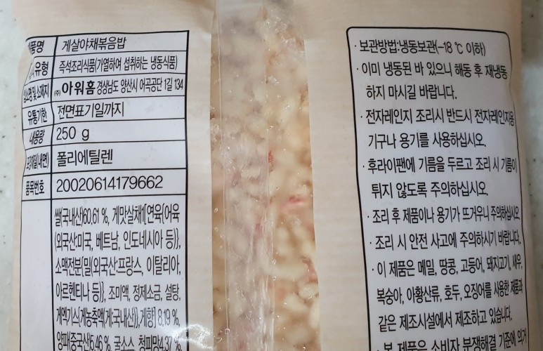 아무튼 그래서 오래 보관하다가 드디어 꺼낸 제품 아워홈에서 나온 게살야채볶음밥이다.