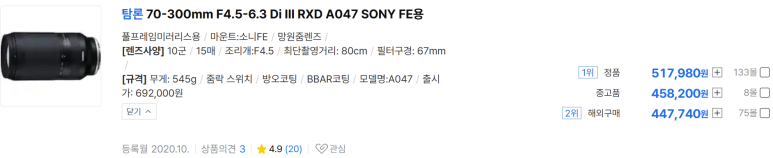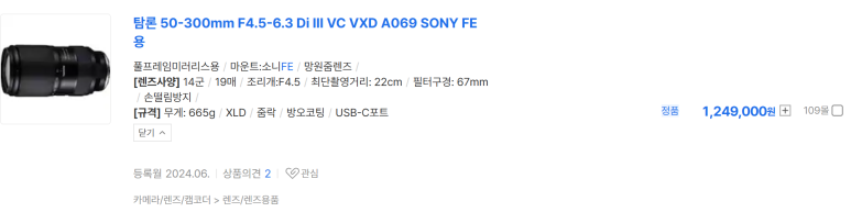 최근에 캐논에서 RF용으로 75-300이라고 더 저렴한 네이티브 렌즈가 나와버려서 부럽긴 한데, 소니 렌즈군에서는 이만한 렌즈가 없다. 정가는 518,000원인데 중고로 사면 더 저렴하고, 행사 기간에 이것저것 사은품을 받거나 해서 체감가를 낮춰서 구매하게 되면 더욱 저렴하게 느껴질 수 있다.