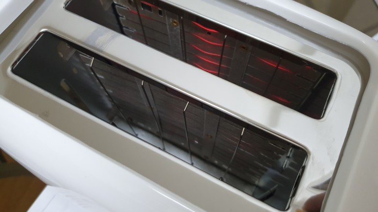 조작부다. 다이얼로 1에서 7단계까지 가열 세기를 조절할 수 있고, 더 이상 가열하고 싶지 않을 경우 STOP 버튼을 누르면 바로 종료되며 식빵이 튀어나온다. 나도 식빵 타는 냄새가 나서 저 버튼을 한 한 번 사용해봤는데 잘 동작하더라.